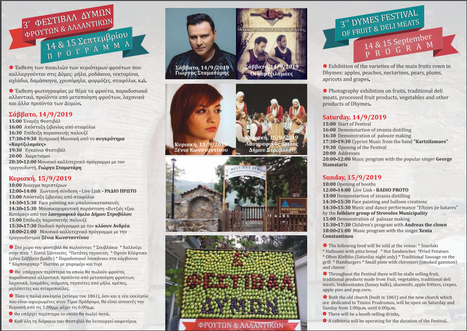 Η Οργανωτική Επιτροπή του 3ου Φεστιβάλ Δυμών Φρούτων και Αλλαντικών ανακοινώνει ότι η Εταιρεία Τουριστικής Ανάπτυξης και Προβολής Τροόδους MyTroodos.com θα παρέχει οργανωμένες εκδρομές και ξεναγήσεις από Λεμεσό για τις Δύμες, την Κυριακή 15 Σεπτεμβρίου 2019.